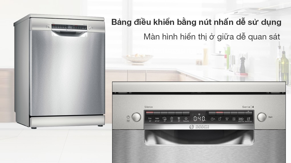 Máy rửa chén độc lập Bosch SMS4HMI07E góp phần nâng cao vẻ đẹp hiện đại cho không gian bếp với thiết kế độc lập hiện đại, gam màu bạc tinh tế đẹp mắt. Công suất hoạt động cực mạnh mẽ 2400W, 6 chương trình rửa đa năng rửa sạch lượng chén bát lớn cho 3 đến 4 bữa ăn Việt. Máy còn cung cấp các công nghệ hiện đại như công nghệ rửa nước nóng diệt khuẩn, loại bỏ vết bẩn hiệu quả, công nghệ sấy PureDry – Heat Exchanger – Bộ trao đổi nhiệt làm khô bát đĩa hiệu quả nhưng vô cùng tiết kiệm điện. Sản phẩm thiết kế bảng điều khiển đơn giản với nhiều tiện ích thông minh cho quá trình sử dụng máy rửa bát hiện đại, tiện nghi hơn.