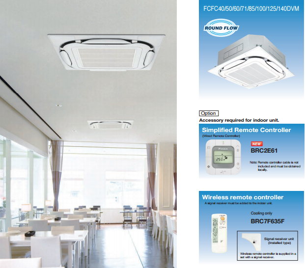 Model FCFC thuộc dòng 1 chiều Inverter, loại máy cassette âm trần đa hướng thổi. Dòng sản phẩm SkyAir mang đến không gian điều hòa chất lượng cao cho các cửa hàng và văn phòng.