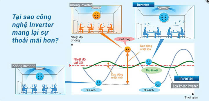 Điều khiển inverter phản ứng khi có sự thay đổi tải và do đó không gây ra những điều chỉnh nhiệt độ đáng kể, Các máy không inverter phải BẬT và TẤT liên tục khi có biến động tải và dẫn đến dao động nhiệt lớn.
