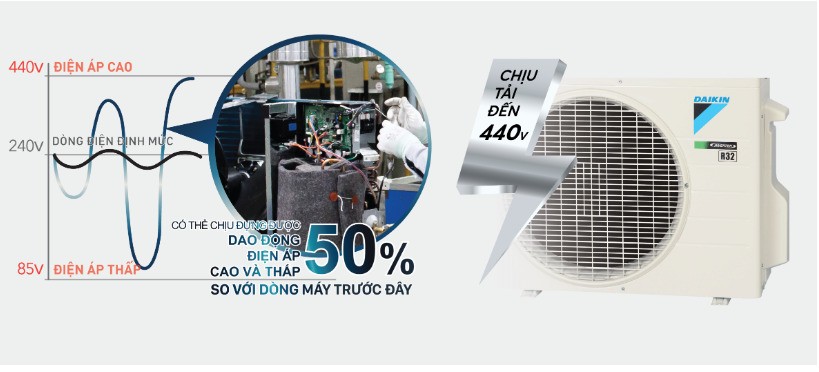 Điều hòa Daikin inverter chịu được tải áp lên đến 440V nên trong những khu vực có điện áp không ổn định, máy vẫn hoạt động bình thường và bảo vệ bo mạch không bị hư hỏng.