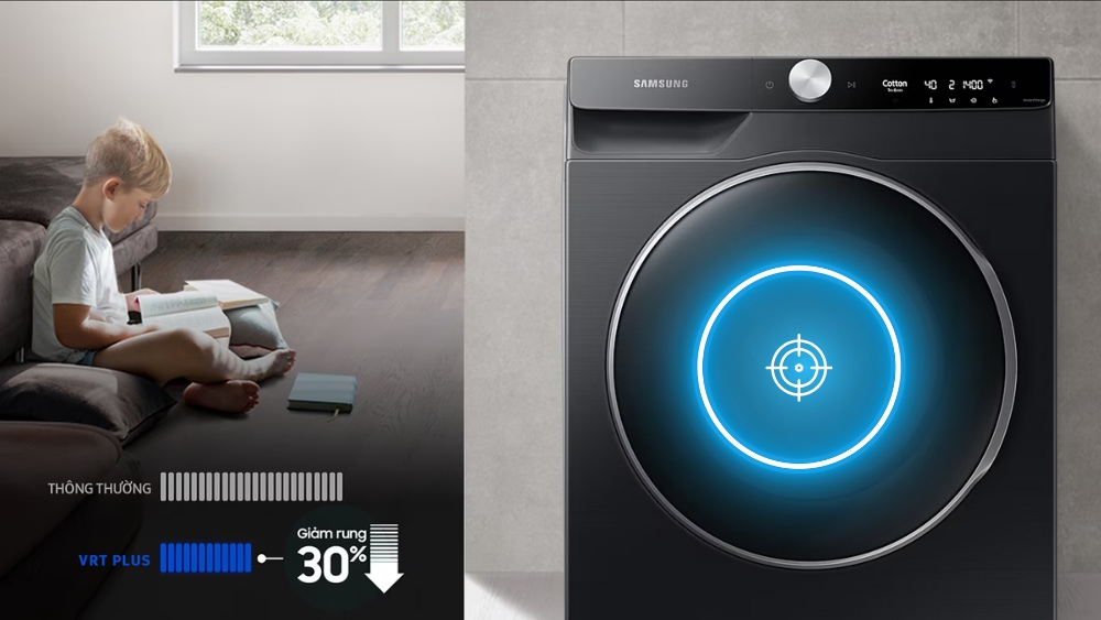 Mặc dù sở hữu khối lượng giặt lớn nhưng máy giặt Samsung WW12CG604DLBSV vẫn hoạt động êm ái đó là nhờ vào việc tích hợp công nghệ VRT Plus™. Thiết kế khung máy mới đã mang đến cho thiết bị sự cân bằng, ổn định cao hơn. Đồng thời máy còn được tích hợp bộ cảm biến phát hiện rung ồn để tối ưu hóa hiệu quả vận hành của động cơ.