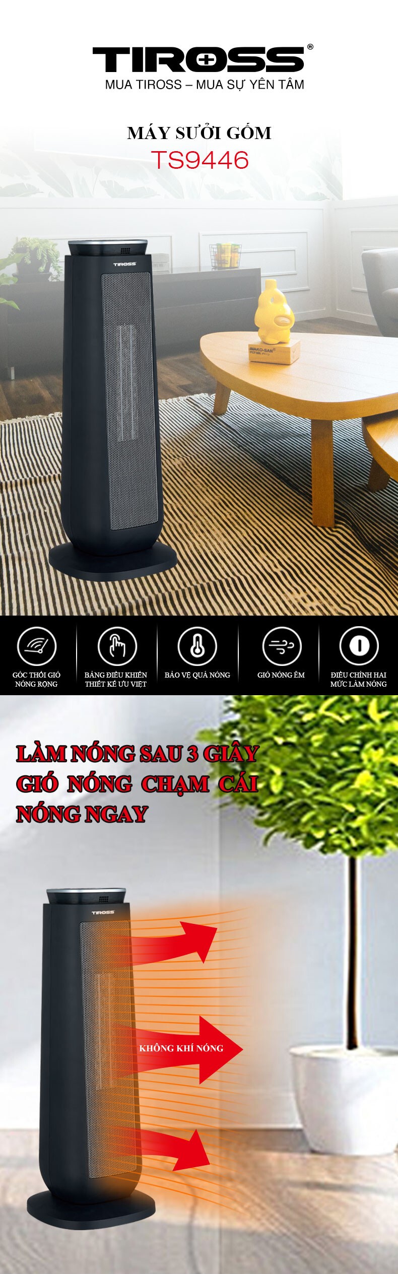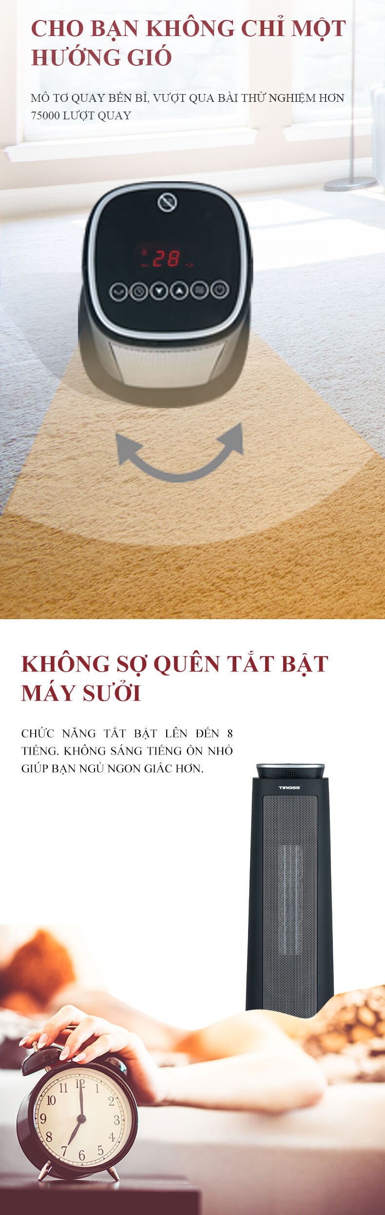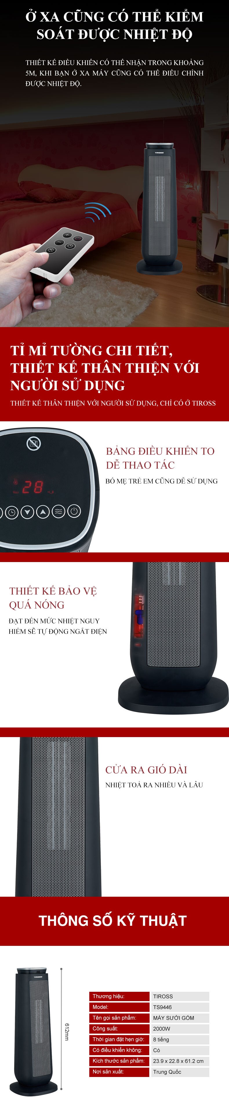2 chế độ nhiệt Chế độ bảo vệ khi nghiêng đổ Chế độ bảo vệ khi quá tải, quá nhiệt Hẹn giờ, góc quay rộng Remote điều khiển từ xa |