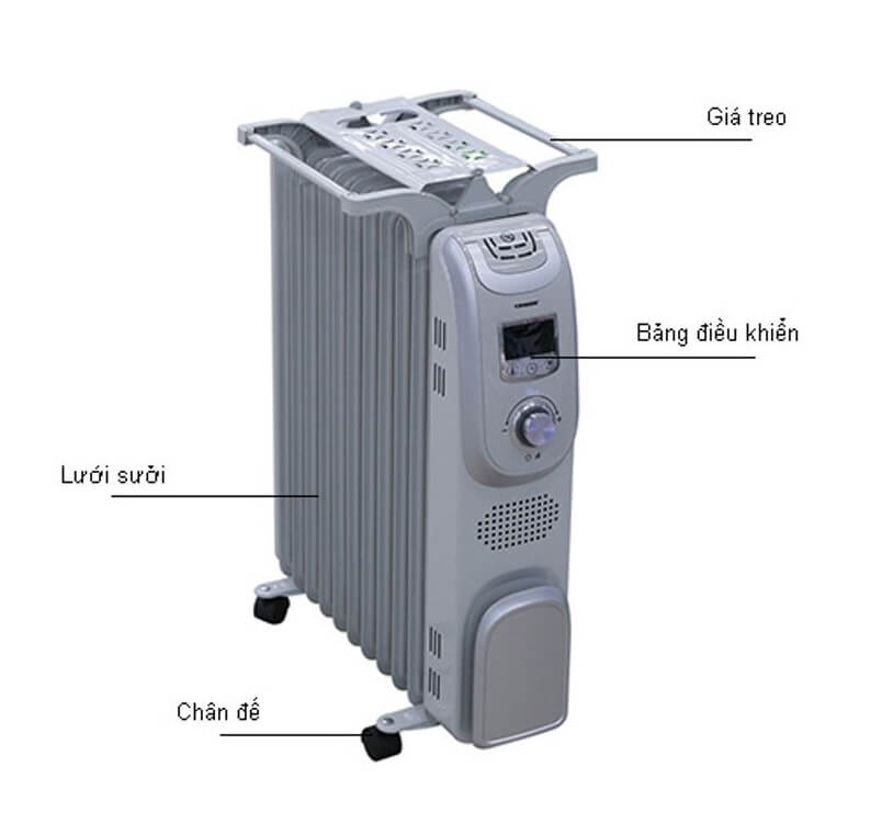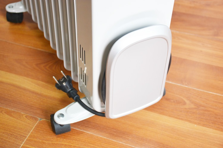 Dưới chân đế máy sưởi được trang bị 4 bánh xe có khả năng xoay 360 độ giúp người dùng có thể di chuyển thiết bị sang phòng khác một cách dễ dàng, không tốn nhiều sức lực. Mặt trước máy có ổ quấn dây điện giúp bạn thu dây gọn gàng sau mỗi lần sử dụng.
