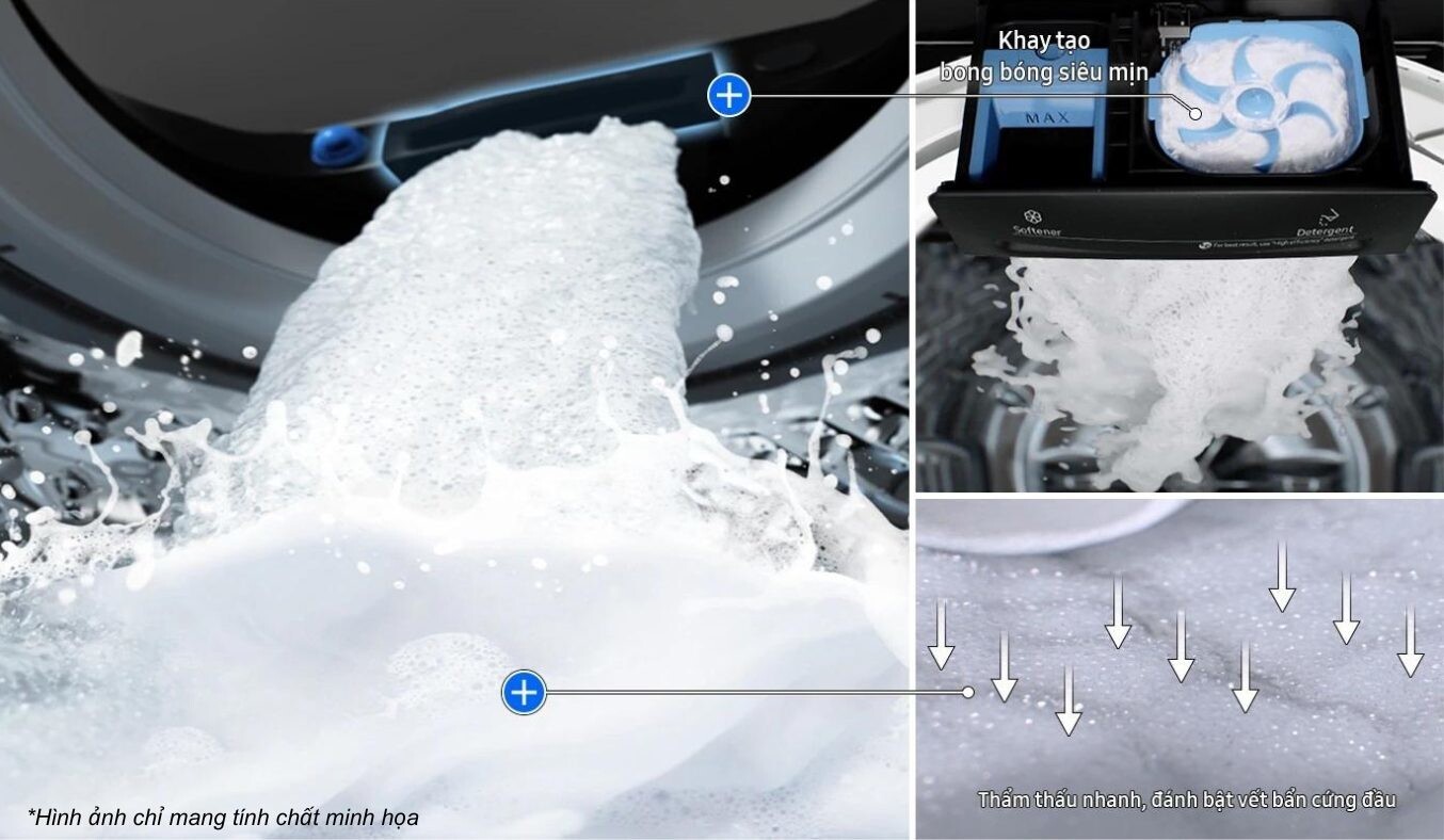 Máy giặt Samsung Inverter 17 kg WA17CG6442BDSV là máy giặt cửa trên Samsung thế hệ mới, áp dụng công nghệ Bong bóng siêu mịn Ecobubble. Cụ thể, công nghệ này thiết kế khay tạo bong bóng siêu mịn thông minh giúp hòa tan hoàn toàn chất tẩy, kết hợp hoàn hảo với xoáy nước đa chiều siêu mạnh. Từ đó, máy giặt giúp làm sạch sâu và đánh bật vết bẩn cứng đầu, đồng thời bảo vệ sợi vải tốt hơn 20%.