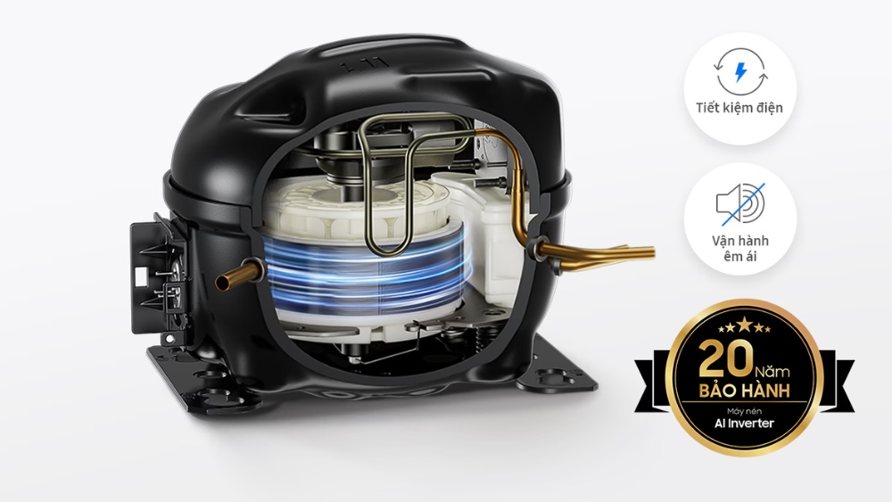 Với cấu trúc được cải tiến, máy nén AI Inverter tăng quán tính đến 4.1 lần, nhờ đó tiêu tốn ít điện năng hơn so với các máy nén thông thường. Dựa theo nhu cầu sử dụng thực tế, máy nén AI Inverter tự động điều chỉnh tốc độ vận hành, giúp tiết kiệm điện tốt hơn, giảm tiếng ồn và kéo dài tuổi thọ máy. Đồng thời máy nén được bảo hành đến 20 năm.