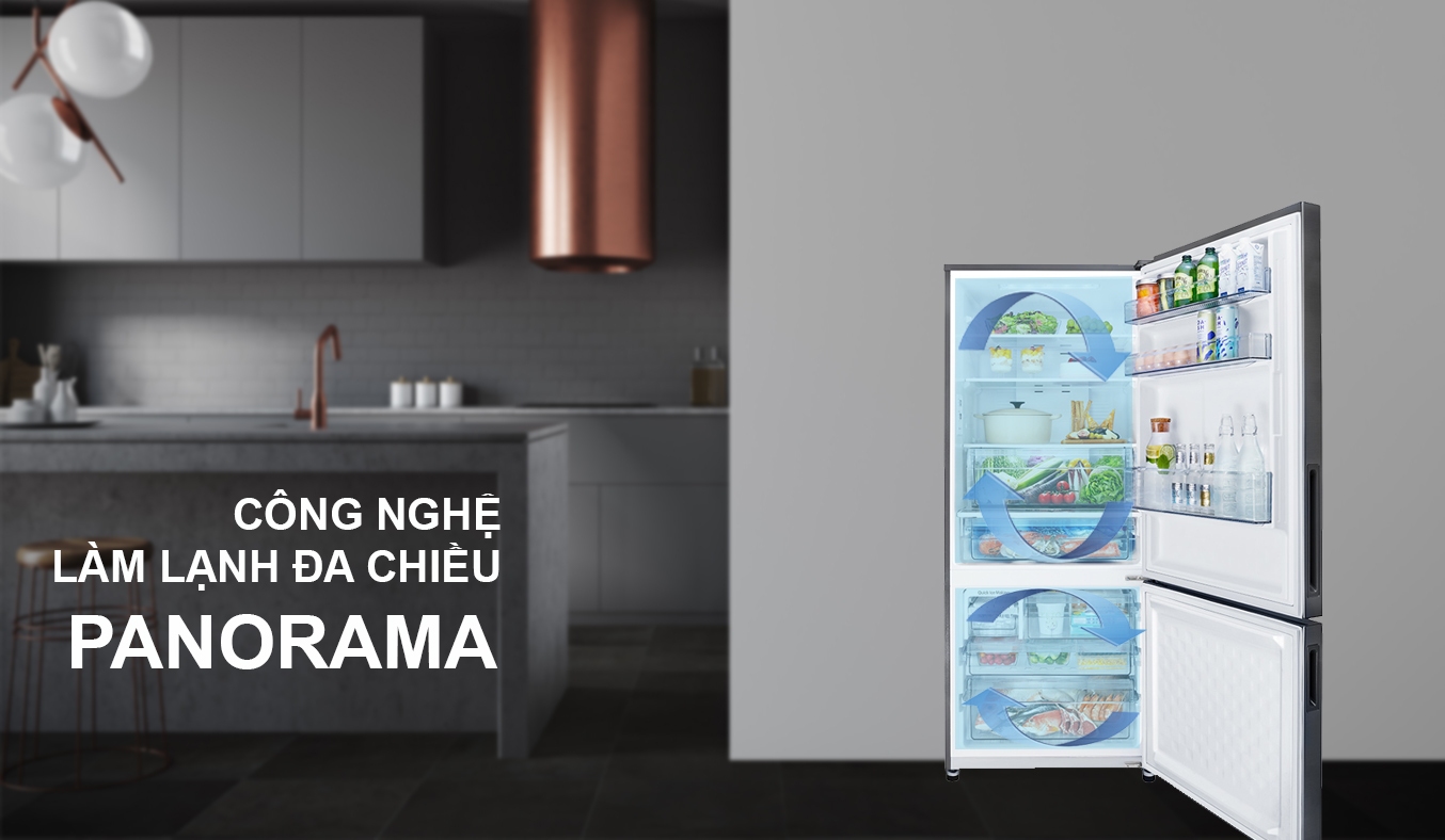 Tủ lạnh Panasonic Inverter 255 lít NR-SV281BPKV trang bị hệ thống làm lạnh Panorama với các luồng khí lạnh vòng cung mang khí lạnh đến mọi ngóc ngách trong tủ lạnh giúp thực phẩm được làm lạnh nhanh chóng và đồng đều dù ở bất kì vị trí nào.