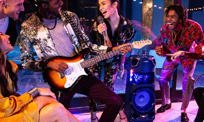 Với dàn âm thanh Hifi Sony MHC-V43D M SP6 bạn có thể điều khiển nhạc, ánh sáng và hơn thế nữa, chỉ cần chạm vào điện thoại hoặc sử dụng giọng nói thông qua ứng dụng Fiestable.