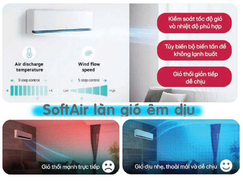 Tùy biến làm mát bằng tính năng SoftAir đây là tính năng mới nhất chỉ được tích hợp trên các dòng điều hòa LG cao cấp, giúp kiểm soát nhiệt độ gió và tốc độ gió thổi trong phạm vi phù hợp để bạn có thể tùy chỉnh làm mát. Tính năng kiểm soát nhiệt độ 9 mức và điều chỉnh tốc độ gió 5 mức cho phép bạn tận hưởng sự cân bằng nhiệt độ và luồng gió 1 cách hoàn hảo phù hợp với sở thích của mình.