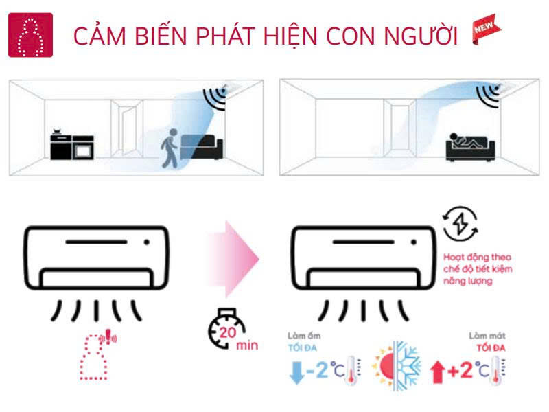 Thì giờ đây LG đã tích hợp công nghệ cảm biến phát hiện con người trên sản phẩm máy điều hòa IPC09M1 9000 BTU inverter 1 chiều của mình.
