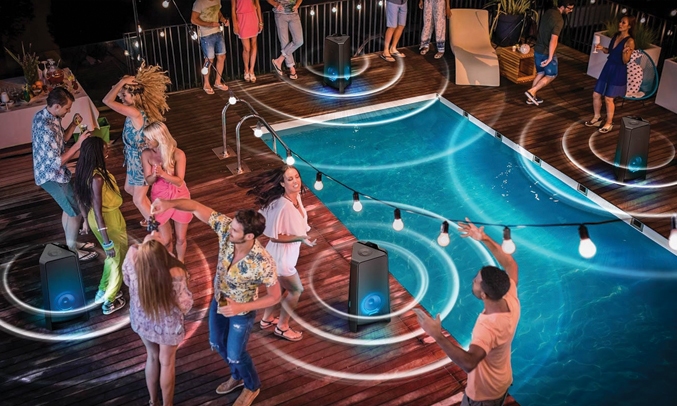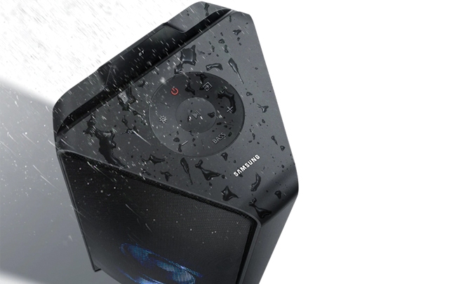 Khả năng kháng nước cao của Loa tháp Samsung MX-T40 hạn chế việc các giọt nước li ti bắn vào trong thiết bị. Bạn hoàn toàn có thể an tâm sử dụng chiếc loa này tại các bữa tiệc bể bơi mà không sợ nước bắn tung tóe làm hư sản phẩm.