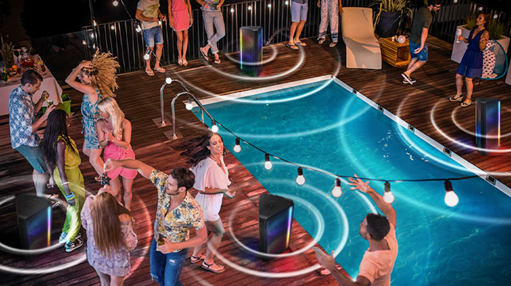- Chế độ Group Play có dây và không dây cho phép bạn kết nối đồng thời nhiều chiếc loa Samsung MX-ST50B với nhau để âm thanh được lan tỏa đến mọi ngóc ngách trong bữa tiệc, cho mọi người đều cùng nhau khiêu vũ trong tiếng nhạc đồng điệu. Chế độ này có thể kết nối được 10 chiếc loa cùng lúc và đường truyền kết nối không dây có thể không ổn định tùy thuộc vào môi trường Bluetooth ở địa điểm sử dụng.