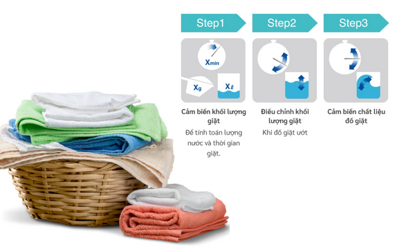 Khối lượng giặt và chất liệu đồ giặt sẽ được xác định qua 3 bước cảm biến để tối ưu hóa chương trình giặt. Từ đó, máy xác định được chính xác các yếu tố để đảm bảo không có sự lãng phí về thời gian, điện năng cũng như nước tiêu thụ.