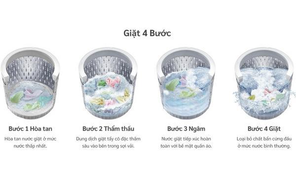 Công nghệ Giặt 4 Bước công suất lớn, chất tẩy thấm sâu, giặt sạch hiệu quả