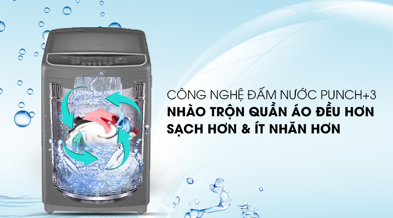 Công nghệ này trên máy giặt LG được tạo ra nhờ có sự kết hợp của 3 mâm giặt phụ. Punch+3 sẽ tạo ra các dòng nước theo phương thẳng đứng, đưa đồ giặt lên và xuống liên tục, mang tới hiệu quả giặt đồng đều, và giảm xoắn rối.