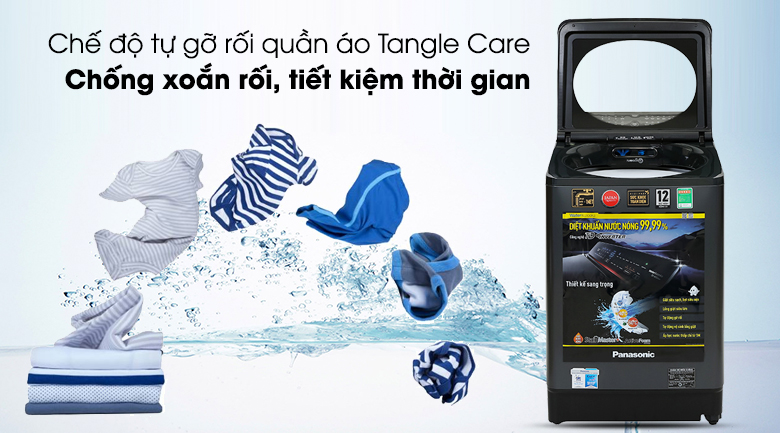 Chế độ tự gỡ rối Tangle Care là chế độ giặt nhẹ nhàng làm giảm hiện tượng xoắn rối quần áo. Sau khi vắt, mâm giặt của máy giặt Panasonic sẽ tiến hành quay chậm trong vòng 4 phút để quần áo được gỡ rối, giúp người dùng dễ dàng lấy quần áo ra khỏi lồng giặt.