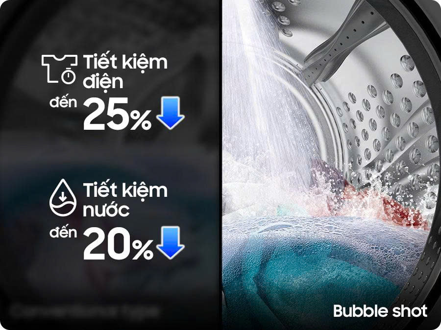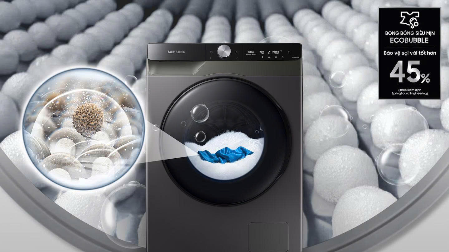Điểm nổi bật trên máy giặt Samsung này chính là công nghệ AI Ecobubble. Công nghệ này tạo ra bong bóng siêu mịn giúp hòa tan bột giặt nhanh chóng, thẩm thấu sâu vào từng sợi vải để loại bỏ vết bẩn hiệu quả ngay cả khi giặt với nước lạnh. Đặc biệt, nhờ cảm biến AI tích hợp, máy có thể nhận biết chất liệu vải để tự động điều chỉnh lượng bong bóng, nhiệt độ, thời gian và tốc độ quay, giúp nâng cao hiệu quả giặt sạch hơn 24% mà vẫn tiết kiệm đến 70% điện năng và bảo vệ sợi vải tốt hơn 45%.