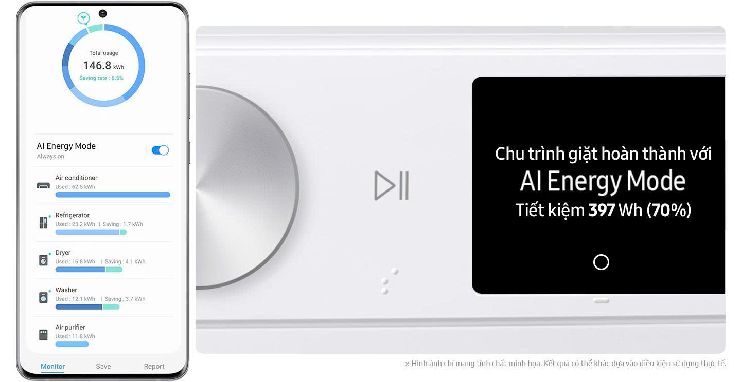 Không chỉ giặt sạch, máy giặt Samsung WW10DG6U34LBSV còn gây ấn tượng với khả năng tiết kiệm điện vượt trội nhờ chế độ AI Energy. Người dùng có thể dễ dàng theo dõi và quản lý lượng điện tiêu thụ thông qua ứng dụng SmartThings, đồng thời tối ưu hóa chu trình giặt với chế độ AI Energy – giúp giảm đến 70% điện năng mà không làm giảm hiệu quả giặt sạch. Đây là một tính năng đặc biệt hữu ích trong bối cảnh giá điện ngày càng tăng cao.