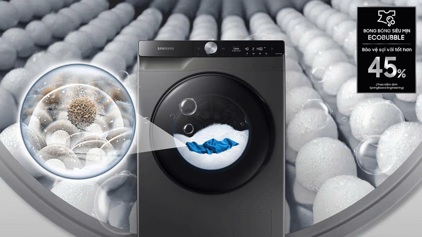 Một trong những điểm nổi bật nhất của dòng máy này là công nghệ AI EcoBubble – sự kết hợp giữa bọt siêu mịn và trí tuệ nhân tạo (AI). Bong bóng siêu mịn giúp hòa tan bột giặt nhanh hơn, thẩm thấu nhanh vào từng sợi vải mà không cần dùng đến nước nóng. AI sẽ tự động nhận diện loại vải và khối lượng đồ giặt, từ đó điều chỉnh lượng bọt, nhiệt độ, thời gian giặt và tốc độ vắt một cách tối ưu.