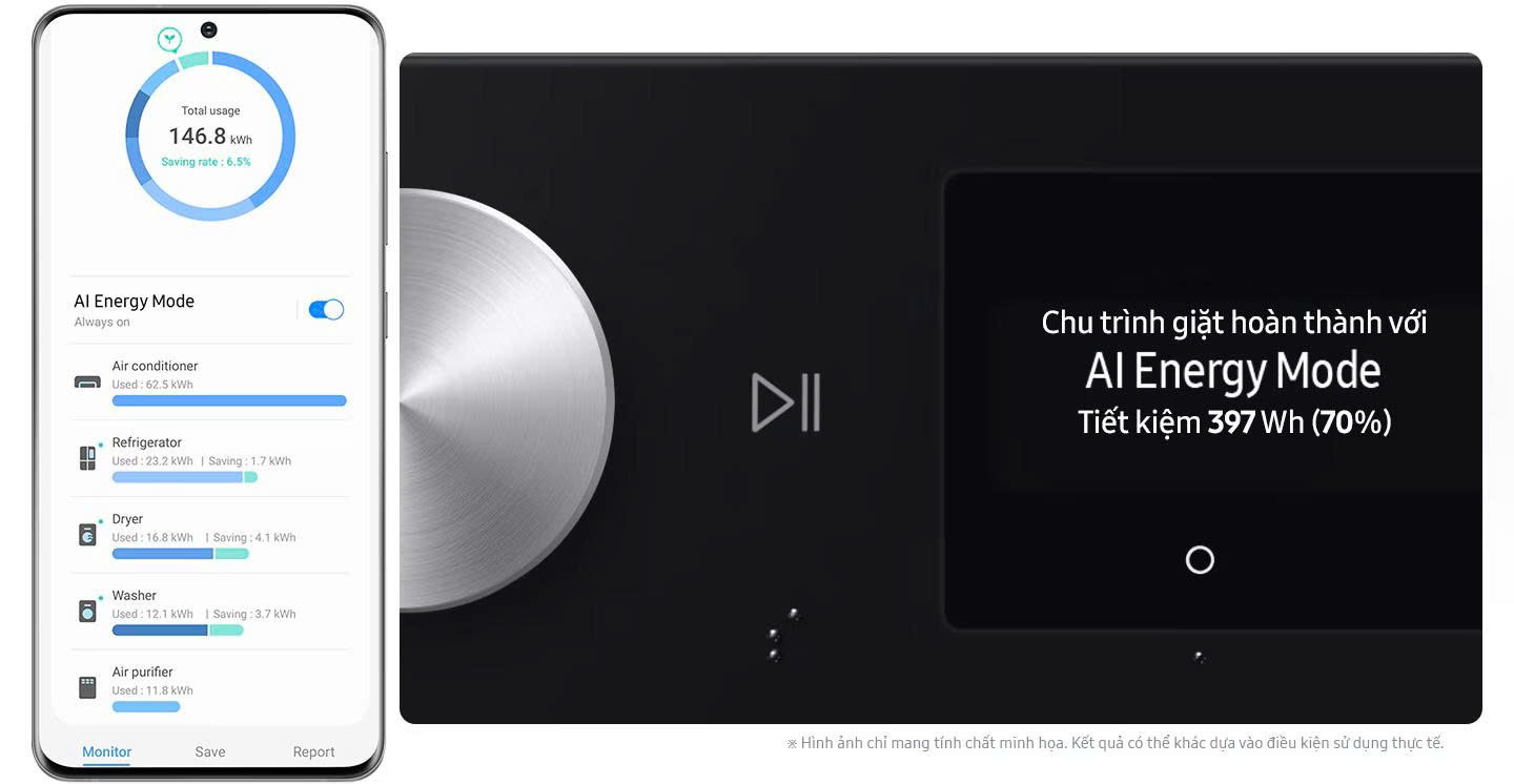 Với chế độ AI Energy, máy giặt Samsung không chỉ làm sạch mà còn giúp bạn chủ động quản lý năng lượng tiêu thụ. Tính năng này cho phép bạn theo dõi mức điện sử dụng theo thời gian thực, dự đoán hóa đơn tiền điện và đưa ra cảnh báo khi mức tiêu thụ vượt ngưỡng. Kết hợp cùng giặt nước lạnh và công nghệ Ecobubble, chế độ này giúp giảm tới 70% lượng điện tiêu thụ, góp phần tiết kiệm chi phí đáng kể cho gia đình.