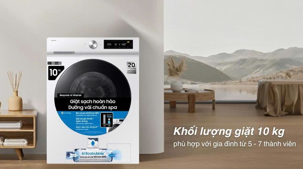 Với chế độ AI Energy, người dùng có thể theo dõi và tối ưu hóa lượng điện tiêu thụ của máy giặt thông qua ứng dụng SmartThings. Máy sẽ tính toán điện năng sử dụng theo từng chương trình giặt, cung cấp ước tính hóa đơn điện hàng tháng, đồng thời đề xuất chế độ giặt tiết kiệm. Đây là tính năng đặc biệt hữu ích trong bối cảnh người tiêu dùng ngày càng quan tâm đến chi phí vận hành và bảo vệ môi trường.