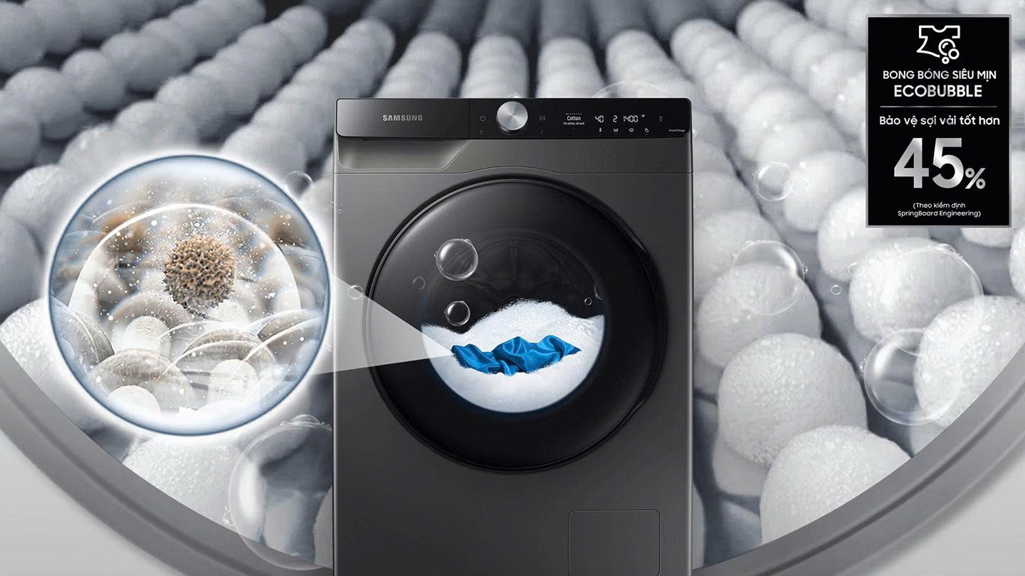 Công nghệ AI EcoBubble độc quyền từ Samsung giúp đánh tan bột giặt thành bong bóng siêu mịn, thẩm thấu nhanh vào sợi vải, giúp giặt sạch sâu ngay cả ở nhiệt độ thấp.