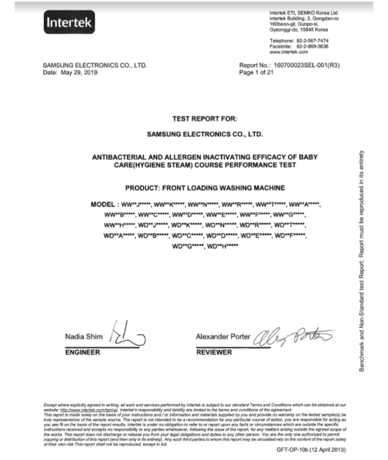 Công nghệ giặt hơi nước Hygiene Steam trên máy giặt Samsung đã được Intertek công nhận về khả năng diệt 99.9% vi khuẩn, ngừa dị ứng.