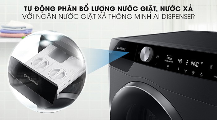 Ngăn nước giặt xả thông minh mang đến cho bạn trải nghiệm hoàn toàn khác với sự tiện ích vô cùng tuyệt vời. Khác với các dòng máy giặt thông thường, chiếc máy giặt Samsung này cho phép bạn cho lượng lớn nước giặt và nước xả vào một lần trong ngăn chứa để bạn sử dụng trong một thời gian dài thay vì cho vào theo mỗi lần giặt như trước kia. Sau đó máy giặt sẽ tự động giúp phân bổ lượng máy giặt cùng với lượng nước cho phù hợp.