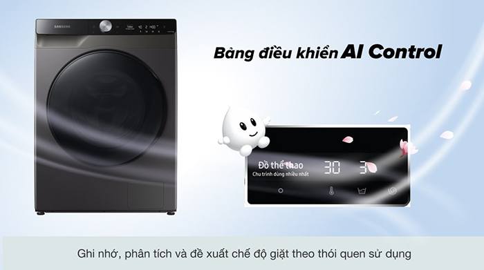 Bảng điều khiển AI Control với tính năng hoạt động vô cùng thông minh lưu giữ, ghi nhớ thói quen sử dụng của người dùng sau mỗi lần thao tác trên bảng điều khiển để đề xuất chế độ giặt thích hợp cho bạn ở những lần sau giúp bạn tiết kiệm được thời gian thao tác cho những lần tiếp theo. Ngoài ra, bạn có thể sử dụng điện thoại thông minh có ứng dụng SmartThings để điều khiển từ xa. Bảng điều khiển AI Control có hướng dẫn tiếng việt giúp đơn giản hóa quy trình sử dụng, dễ dàng thao tác, dễ dàng điều khiển.