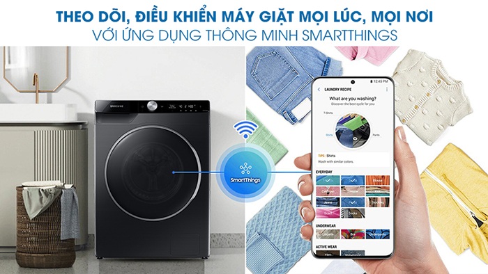 Điện thoại của bạn có tải cài đặt ứng dụng SmartThings cho phép bạn có thể dễ dàng điều khiển và theo dõi quá trình giặt của máy ngay cả khi bạn phải ra ngoài đi chợ hay sang nhà hàng xóm chơi . Ngoài ra ứng dụng SmartThings sẽ gợi ý cho bạn chế độ giặt nhờ vào tính năng cảm biến về độ bẩn, màu sắc, chất liệu của từng sợi vải. Bạn cũng có thể dễ dàng khắc phục, sửa chữa hỏng hóc thông qua chiếc điện thoại thông minh có kết nối ứng dụng Smartthings
