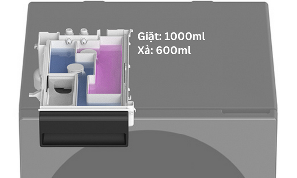 Máy có ngăn chứa nước giặt xả lớn, ngăn chứa nước giặt dung tích 1000ml và ngăn nước xả 600ml. Nhờ đó, bạn tiết kiệm được thời gian vì đổ 1 lần mà giặt được nhiều lần. Ngoài ra, máy có cảm biến thông minh tự động phân bổ nước giặt xả phù hợp với lượng quần áo để bạn không phải tự cân đo đong đếm tốn thời gian, cũng như giúp tiết kiệm được chất giặt xả.