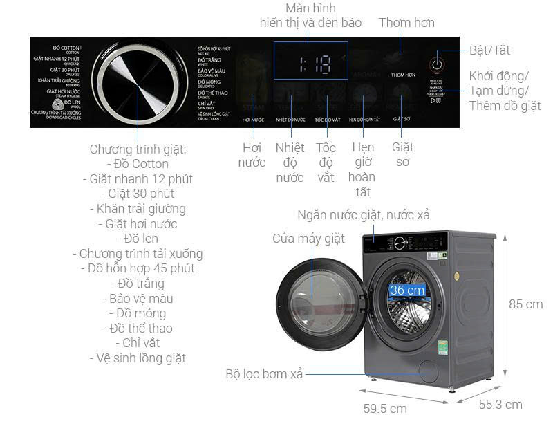 – Bảng điều khiển song ngữ Anh – Việt cảm ứng màu kèm nút xoay nhạy bén, màn hình LED sắc nét với hình ảnh minh họa rõ ràng, có chữ và số hiển thị to rõ cho thao tác điều khiển thiết bị nhẹ nhàng và thân thiện hơn.