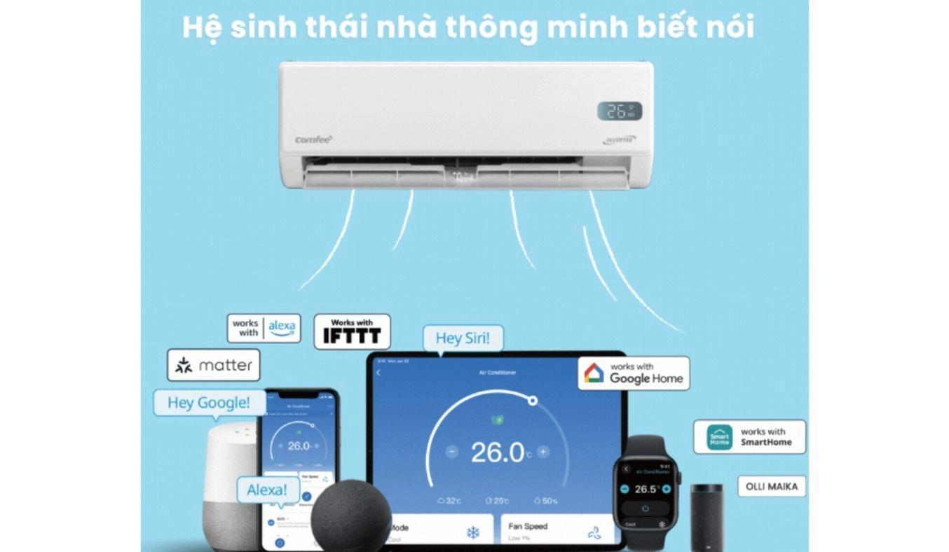 Với khả năng kết nối hệ sinh thái nhà thông minh, điều hòa Comfee hỗ trợ kết nối nhiều thiết bị, bao gồm máy tính bảng, loa thông minh và đồng hồ thông minh, cho phép bạn điều khiển điều hòa rảnh tay tại nhà bất cứ lúc nào.