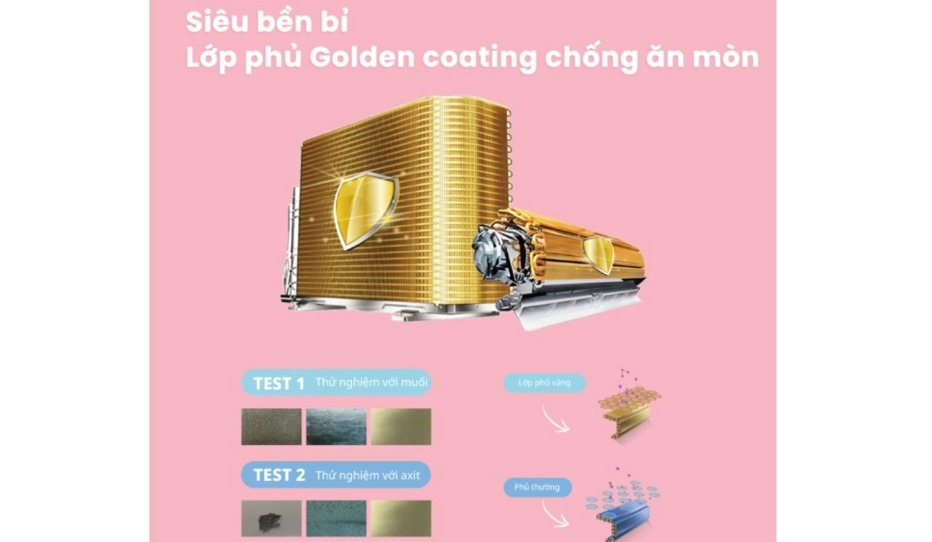 Lớp phủ Golden Coating có khả năng chống oxy hóa và ăn mòn tốt hơn so với các lá tản nhiệt thông thường, giúp máy hoạt động ổn định và bền bỉ hơn.