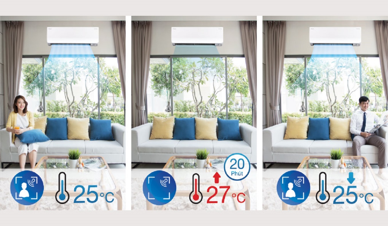 Máy lạnh Daikin Inverter 2 HP FTHF50VVMV sở hữu Cảm biến Mắt thần thông minh có khả năng phát hiện chuyển động của người trong phòng ngăn hao phí điện năng. Nếu không có chuyển động hay nói khác hơn là không có người nào trong phòng trong 20 phút, điều hòa sẽ tự động tăng nhiệt độ cài đặt 2 độ C. Và khi phát hiện có người quay trở lại, điều hòa sẽ giảm 2 độ C.