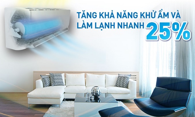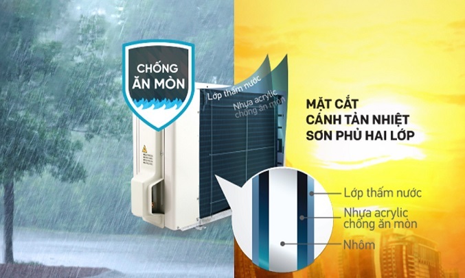 Các cánh trao đổi nhiệt dàn nóng được sơn phủ 2 lớp tĩnh điện: lớp nhựa acrylic và lớp chống thấm nước để tăng khả năng chống mưa axit và sự ăn mòn của muối, góp phần kéo dài tuổi thọ của sản phẩm.