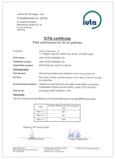 Máy lọc không khí Hitachi EP-PF90J được trang bị một bộ lọc HEPA cao cấp H13 chứa chất chống dị ứng nguồn gốc bạc (Ag) loại bỏ 99,97% các hạt bụi mịn PM2.5 có kích thước nhỏ tới 0.3µm và loại bỏ 90% các hạt có kích thước nhỏ tới 0.02µm.