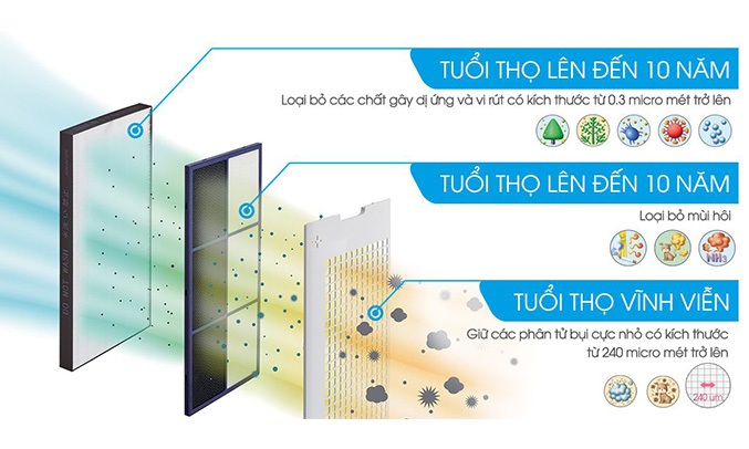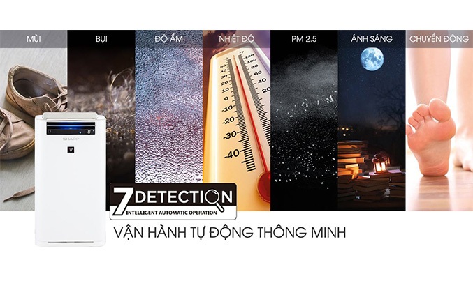 Máy vận hành tự động thông minh 7 cảm biến được tích hợp bao gồm cảm biến bụi, mùi, cảm biến PM 2.5 phát hiện bụi cực nhỏ, cảm biến nhiệt độ - độ ẩm, cảm biến ánh sáng và chuyển động.