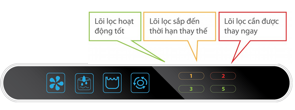 Biểu tượng lõi lọc trên màn hình là màu xanh tức là lõi lọc hoạt động tốt. Khi lõi lọc gần đến thời hạn thay thế thì trên màn hình của hệ thống sẽ hiển thị màu vàng. Khi biểu tượng là màu đỏ thì lõi lọc cần được thay thế ngay lập tức để đảm bảo chất lượng nước đầu ra tốt nhất.
