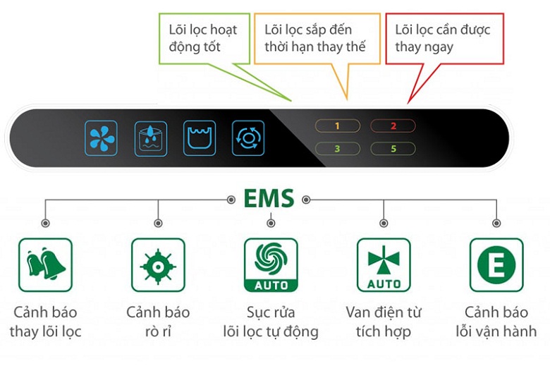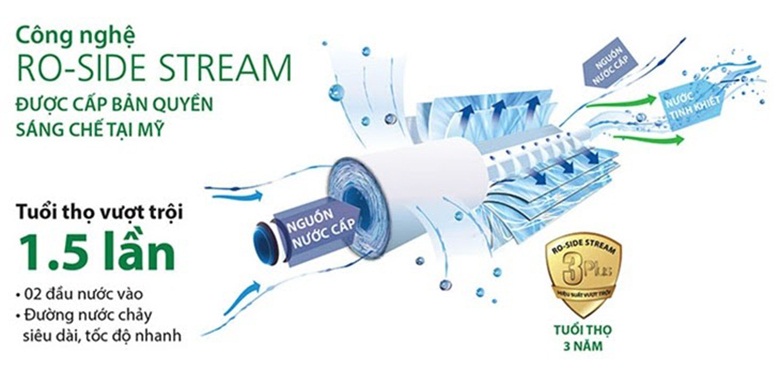 Màng lọc RO – Side Stream công nghệ Mỹ, giúp nâng cao hiệu suất sử dụng và kéo dài tuổi thọ lõi lọc, loại bỏ 99,9% kim loại nặng (Asen, chì, thủy ngân…) và các hợp chất hữu cơ, vi khuẩn có hại, mang đến nguồn nước sạch, trong lành, an toàn với sức khỏe người dùng.