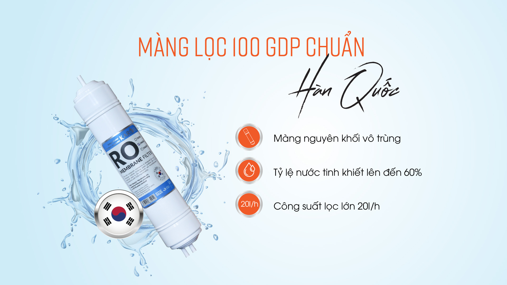 Màng lọc RO xuất xứ chuẩn Hàn Quốc có thiết kế nguyên khối vô trùng với công suất lọc lên đến 20L/H giúp thu được tỉ lệ nước tinh khiết lên đến 60%.