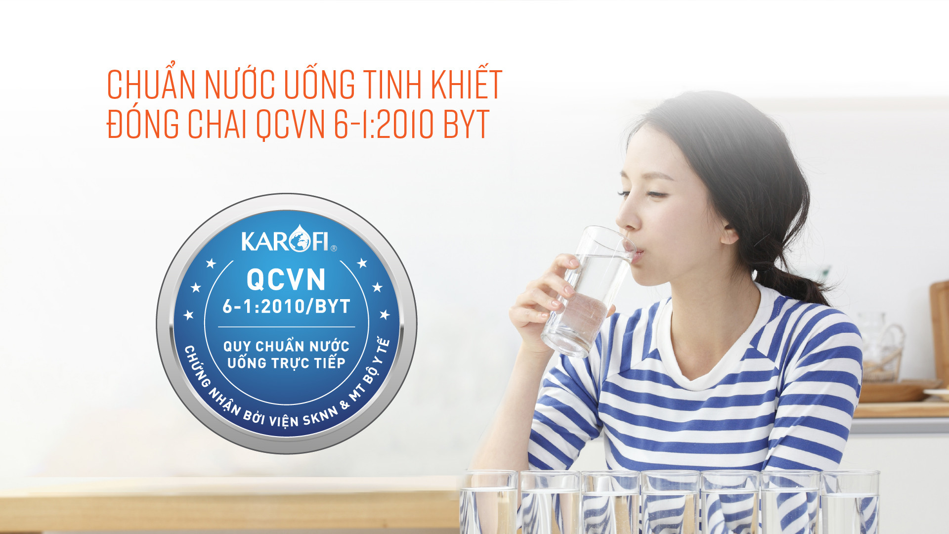Nguồn nước sau lọc từ máy lọc nước Karofi Livotec 212 đạt chuẩn nước uống tinh khiết đóng chai QCVN 6-1:2010 BYT do Viện Sức khỏe nghề nghiệp & Môi trường – Bộ Y Tế công nhận