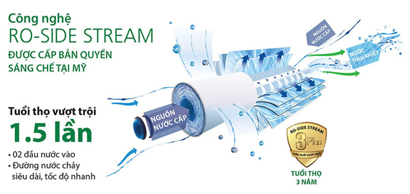 - Kéo dài tuổi thọ lõi lọc RO (3 năm) lên trên 1,5 lần so với màng RO truyền thống. Lõi lọc RO – Side Stream được kiểm tra và chứng nhận bởi Hiệp hội nước toàn cầu (WQA)