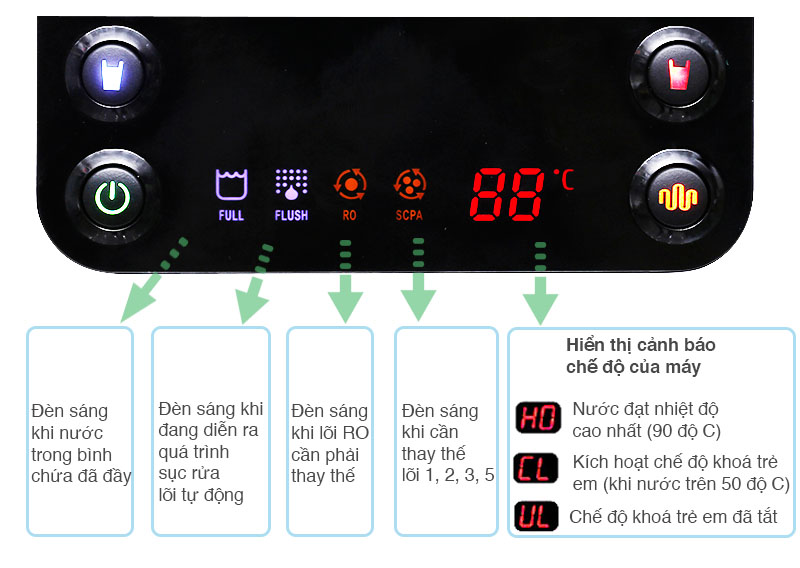 Hệ thống đèn báo khi tự động sục rửa màng lọc, thay thế lõi hoặc các lỗi trên máy giúp bạn dễ dàng kiểm soát máy khi sử dụng
