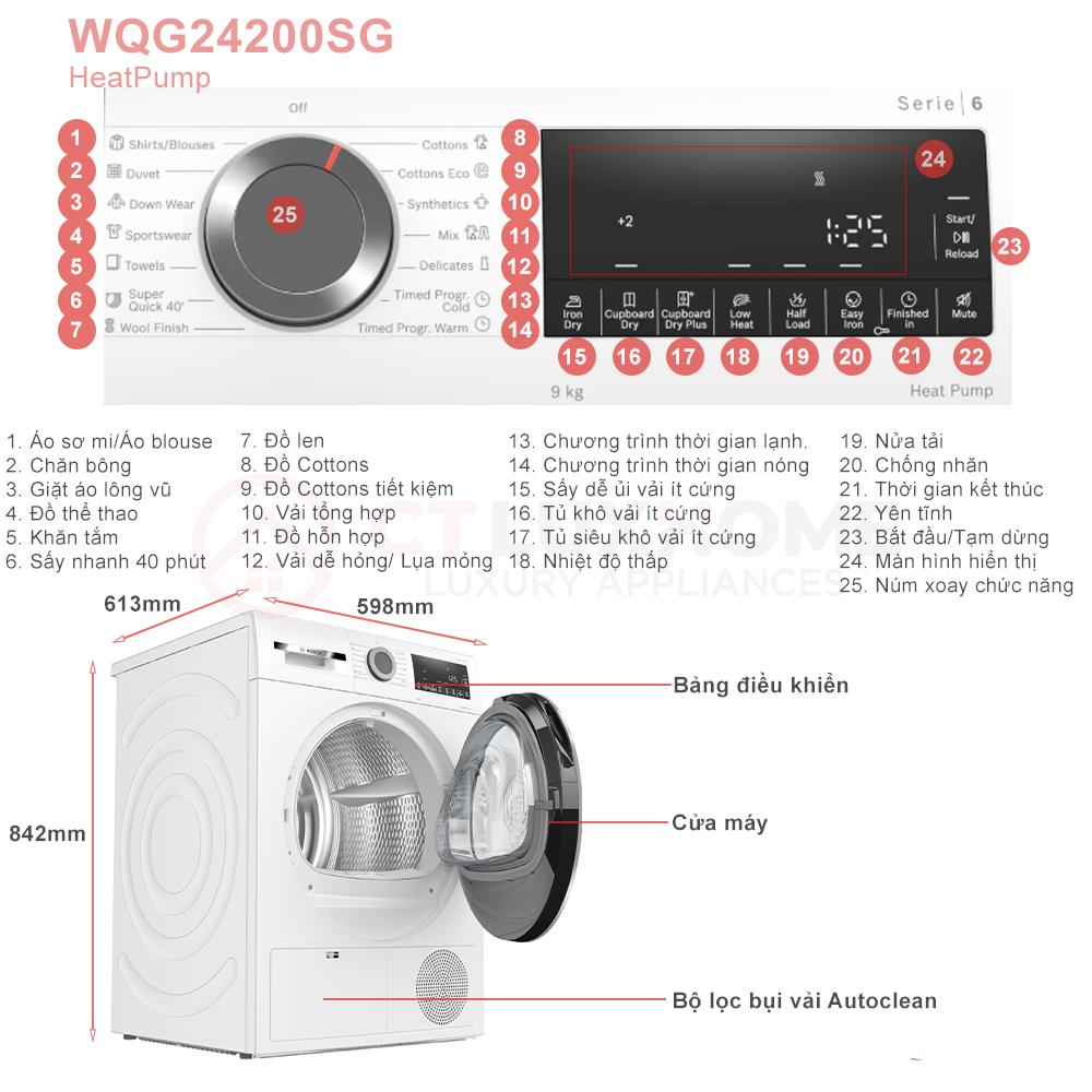 - Máy sấy bơm nhiệt Bosch 9kg WQG24200SG sở hữu kiểu dáng tinh tế, kết hợp với gam màu trắng trung tính, thanh lịch, thích hợp với nhiều phong cách nội thất khác nhau.