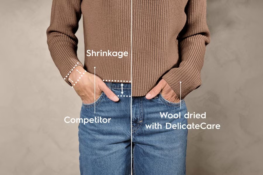 Tự tin sấy khô những bộ quần áo len quý giá nhất của bạn được ghi nhãn có thể giặt máy hoặc giặt tay. Máy sấy được chứng nhận Woolmark Blue của chúng tôi đáp ứng các tiêu chí cụ thể giúp bảo vệ sợi len khỏi bị hư hại trong quá trình sấy – giúp giữ gìn đồ len của bạn lâu hơn.*Chu trình len được chứng nhận bởi The Woolmark Company. Thực hiện theo nhãn chăm sóc quần áo để biết thông tin về sấy khô và hướng dẫn giặt giũ khác.