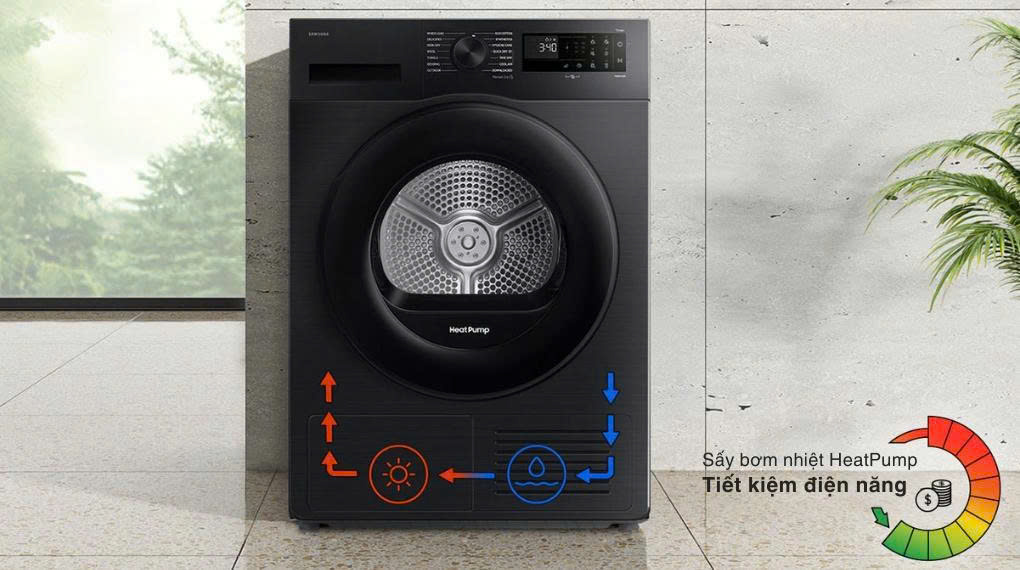 Một trong những điểm nổi bật của máy sấy quần áo Samsung DV90T6240LB/SV là công nghệ sấy bơm nhiệt Heatpump giúp tiết kiệm điện năng tối ưu. Công nghệ này sử dụng máy nén để nén ga, tạo nhiệt độ cao và tuần hoàn không khí qua quần áo để làm khô mà không tiêu tốn quá nhiều năng lượng.