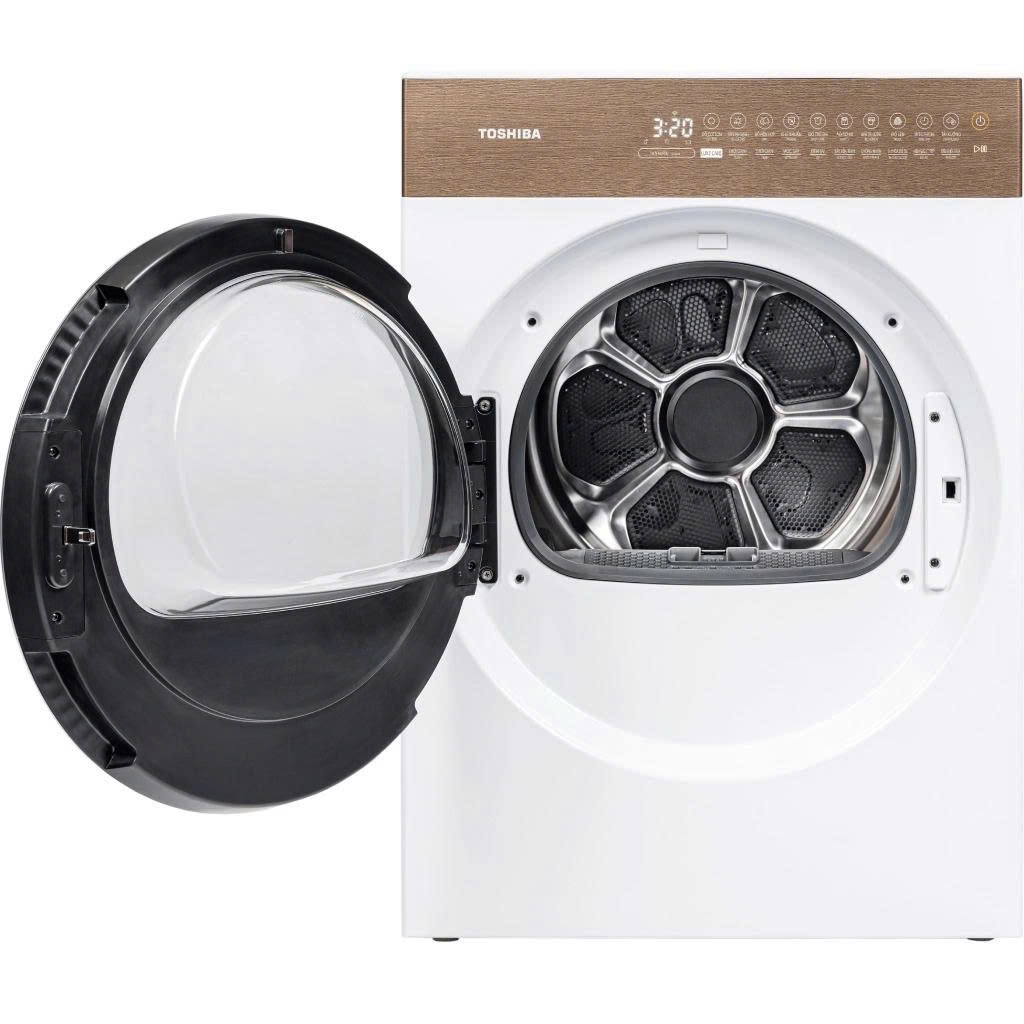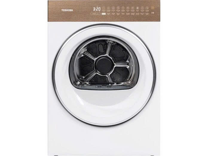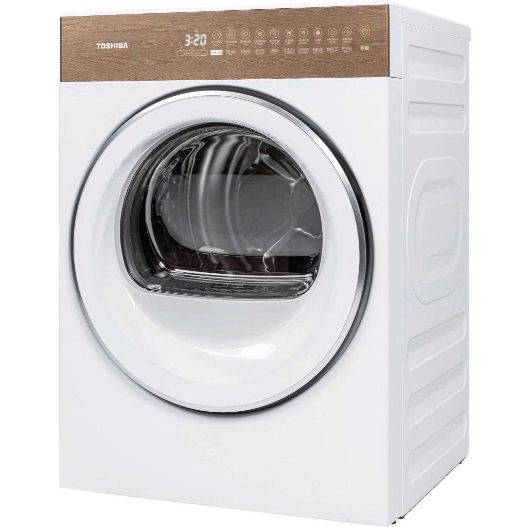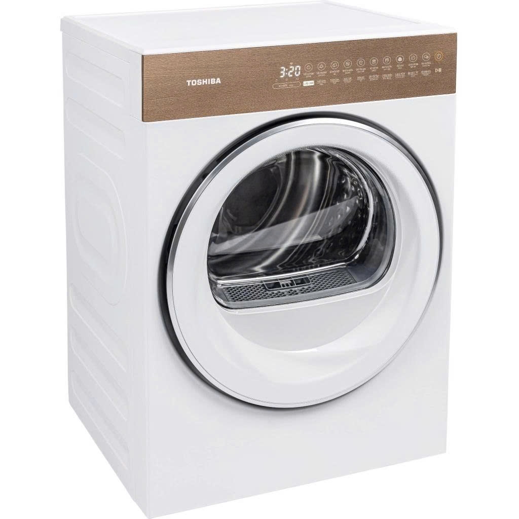 - Máy sấy Toshiba có thiết kế cửa trước lồng ngang hiện đại, dễ lắp đặt cùng máy giặt hoặc bố trí riêng biệt trong không gian nội thất.