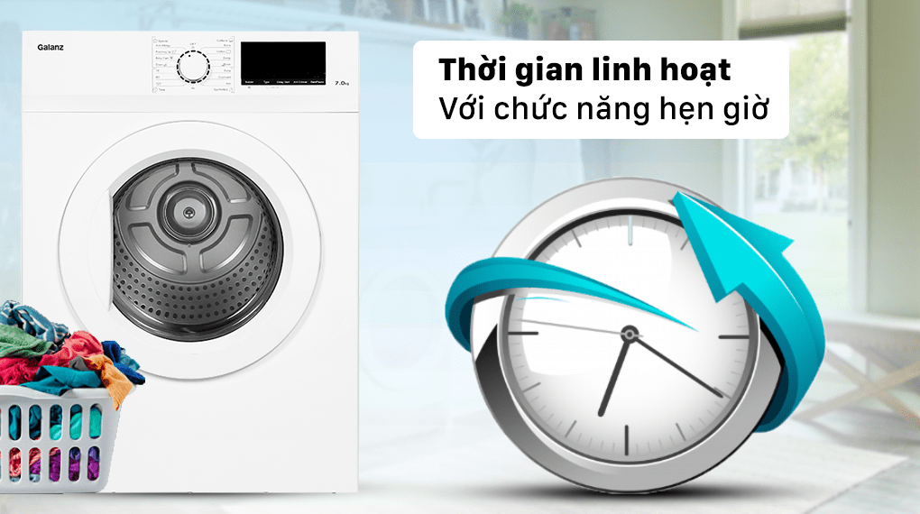 Máy sấy được trang bị tính năng hẹn giờ sấy, giúp người dùng dễ dàng sử dụng và cài đặt linh hoạt thời gian sấy mà mình muốn, tránh để quần áo quá lâu tạo mùi hôi khó chịu. Tính năng này sẽ phù hợp với những người bận rộn trong công việc hằng ngày.