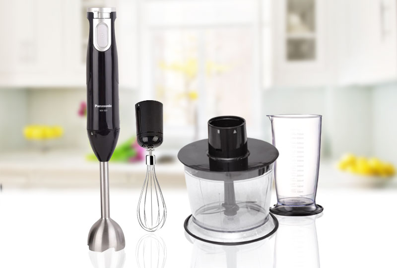 Máy xay sinh tố cầm tay Panasonic PASO-MX-SS1BRA được trang bị 1 cây xay, 1 cây đánh trứng và 1 cốc đo bằng nhựa cao cấp dễ vệ sinh.