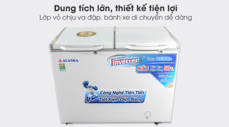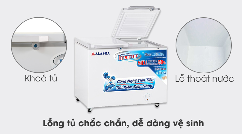 - Tủ đông Alaska BCD-5568CI có 2 cánh mở vali được thiết kế dày, tay cầm nổi rất tiện, bản lề có thể chỉnh cánh tủ với góc rộng 70 độ, có khóa an toàn giúp dễ dàng cho hoặc lấy thực phẩm trong tủ. Lòng tủ bằng nhôm sơn lạnh nhanh, chống đóng tuyết tối đa.